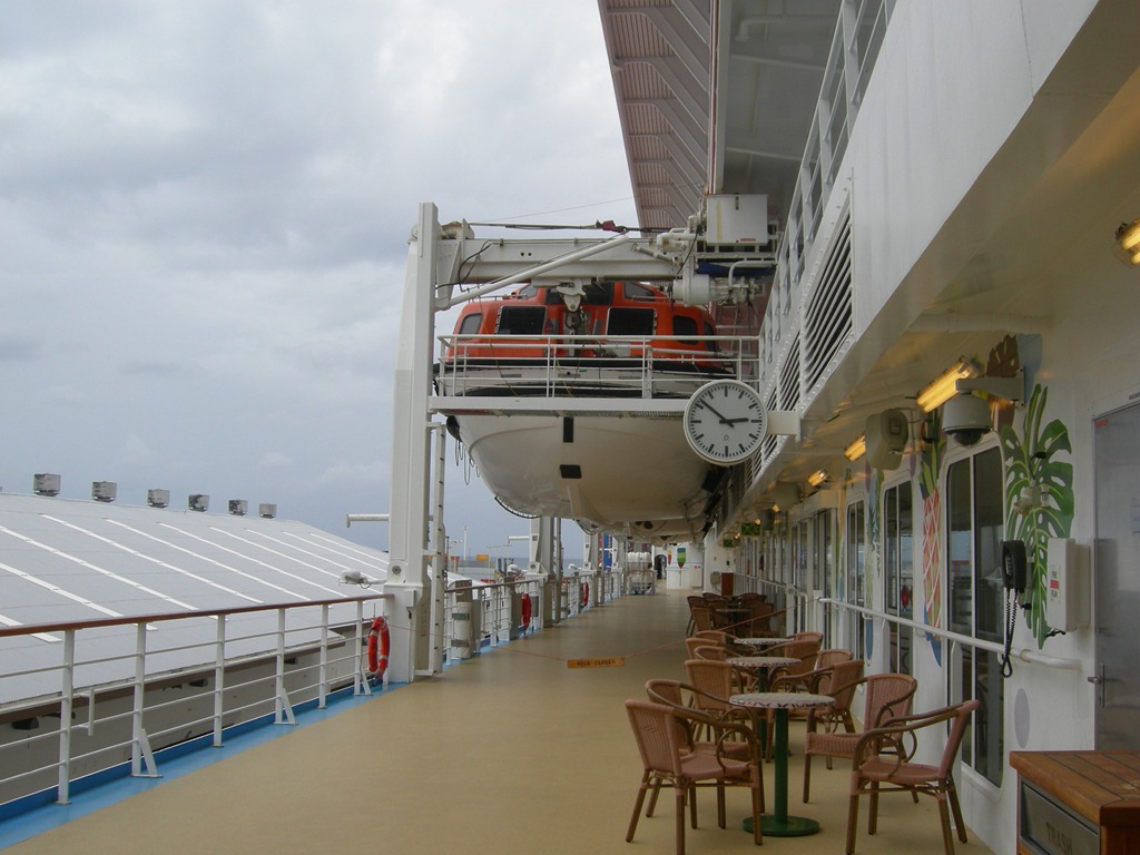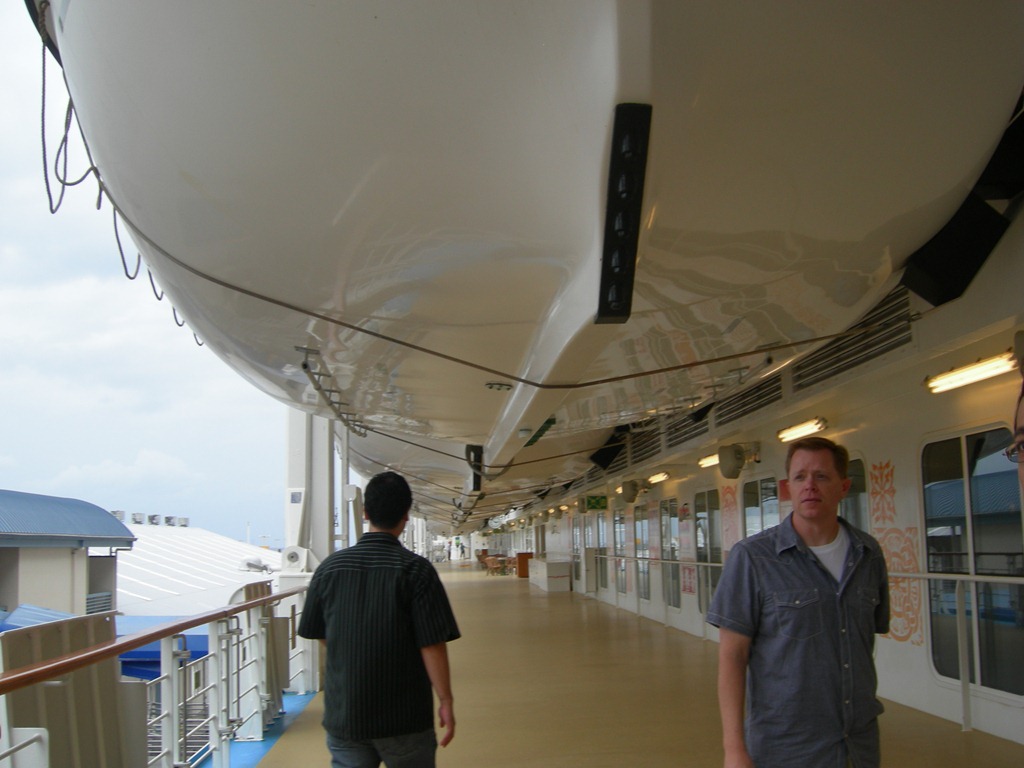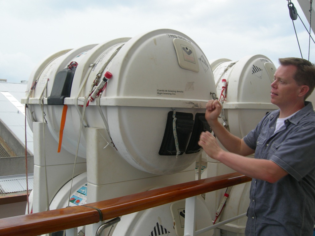 The next safety feature we learned about on the boat were the lifeboats. There were two types of lifeboats. The first ones we saw were the inflatable lifeboats, I recognize those from most movies I’ve seen. The rafts are lowered into the water by these hooks on the side of each row of canisters.