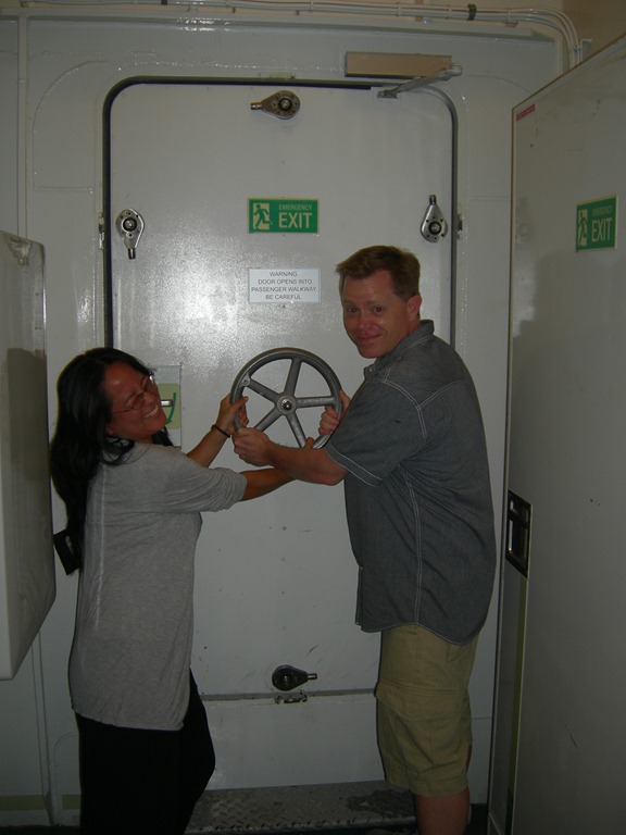 Once on the other side (see lever) we learned that the wheel on the door was used to seal the inside of the cabin to be water tight.