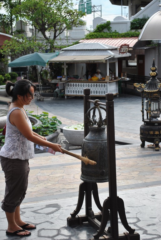On the way out we rang the bells, to tell the gods our names, and put gold leaf on the erawan to show respect and earn merit from the deity.