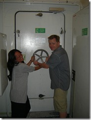 Once on the other side (see lever) we learned that the wheel on the door was used to seal the inside of the cabin to be water tight.